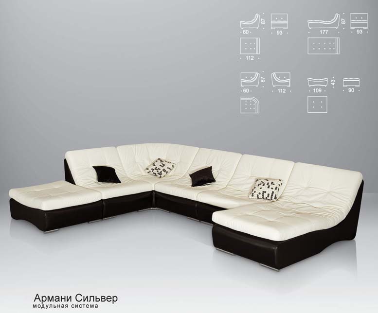 Серия мебели «Армани Сильвер» представляет собой систему, состоящую из большого количества отдельных модулей, которые имеют единое архитектурно-художественное и конструкторско-технологическое решение. Модули можно добавлять или убирать, формируя пространство для отдыха как в простых, так и сложных по форме помещениях, а также в процессе эксплуатации менять конфигурацию дивана. В этой модели для облегчения соединения секций применяются специальные скрытые замки, с помощью которых можно менять секции между собой. Например, из правостороннего углового дивана, можно сделать левосторонний или превратить угловой диван в отдельно стоящие диван и кресло. Так что с модульной системой «Армани Сильвер» перестановка мебели в вашей квартире уже не будет казаться столь затруднительной или невозможной.