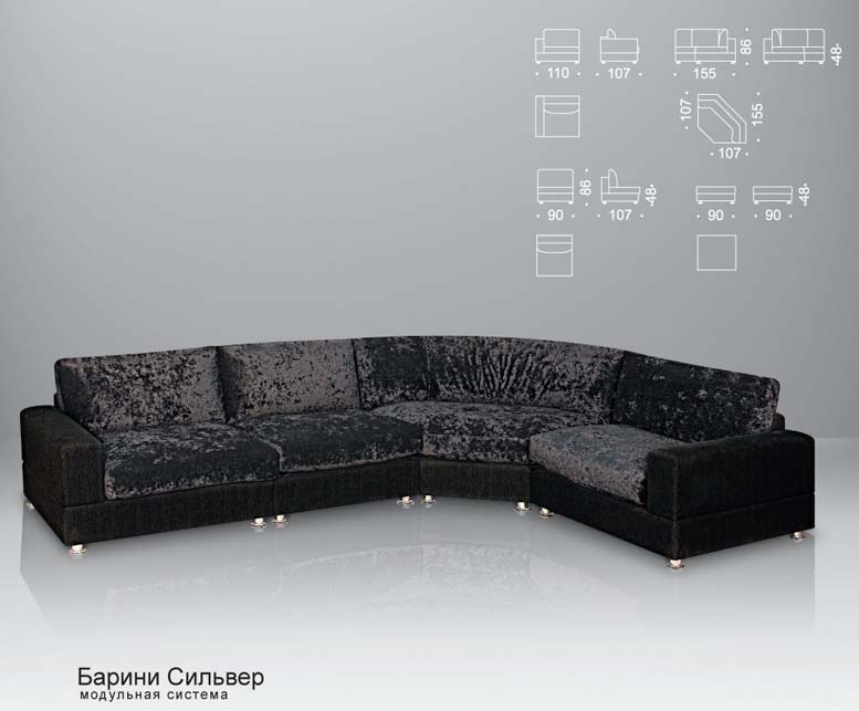 Серия мягкой мебели «Барини Сильвер» имеет современный европейский дизайн и предназначена для отдыха в положении «сидя», отличается оригинальностью форм мягких элементов и боковин, повышенной комфортабельностью и удобством эксплуатации. Остановив выбор на этой модульной системе, вы получите оригинальное решение интерьера гостиной. Одной из особенностей этой модели является применение в ее изготовлении резинотканевых ремней, эластичного пенополиуретана и струттофайбера, что создает высокую степень мягкости и упругости одновременно. В подушках спинки заложена система подвижных сот различной формы, которые заполнены гиппоаллергенным синтетическим пухом, обладающим уникальной способностью одновременно обеспечивать необходимый уровень поддержки в заданных зонах и снимать напряжение с мышц плечевого пояса и спины. Серия мебели «Барини Сильвер» представляет собой систему, состоящую из отдельных модулей, которые имеют единое архитектурно-художественное и конструкторско-технологическое решение. Каждый из модулей «Барини Сильвер» имеет свое обозначение. В состав набора входят: кресло мод.1, кресло мод.2, кресло угловое, банкетка.
